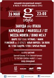26 Мая (четверг) 18:00 | G-Style Shop ТЦ «Цветной» | Большой праздничный концерт в честь 7-летия компании G-Style | Зануда ака Птаха, Карандаш, Mezza Morta, Dino MC47, Marselle, ST, N’Pans, Шарп (True Star), 9 Жизней (ex. G-Style), Nanik, Илья Киреев, За Полк, IQ, Стас Сацура, Стен, Братья Praddd...